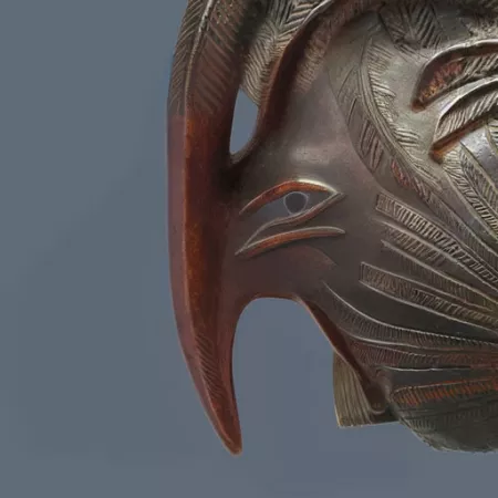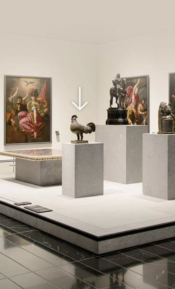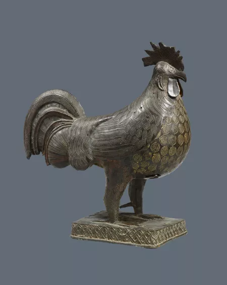 تكريم ملكي: يكرّم هذا الديك الملكة الأم في مملكة بنين. تفاصيل الديك الدقيقة مصورة بإتقان بالغ. لاحظوا الأنماط المختلفة المستخدمة لتصوير ريشه.
